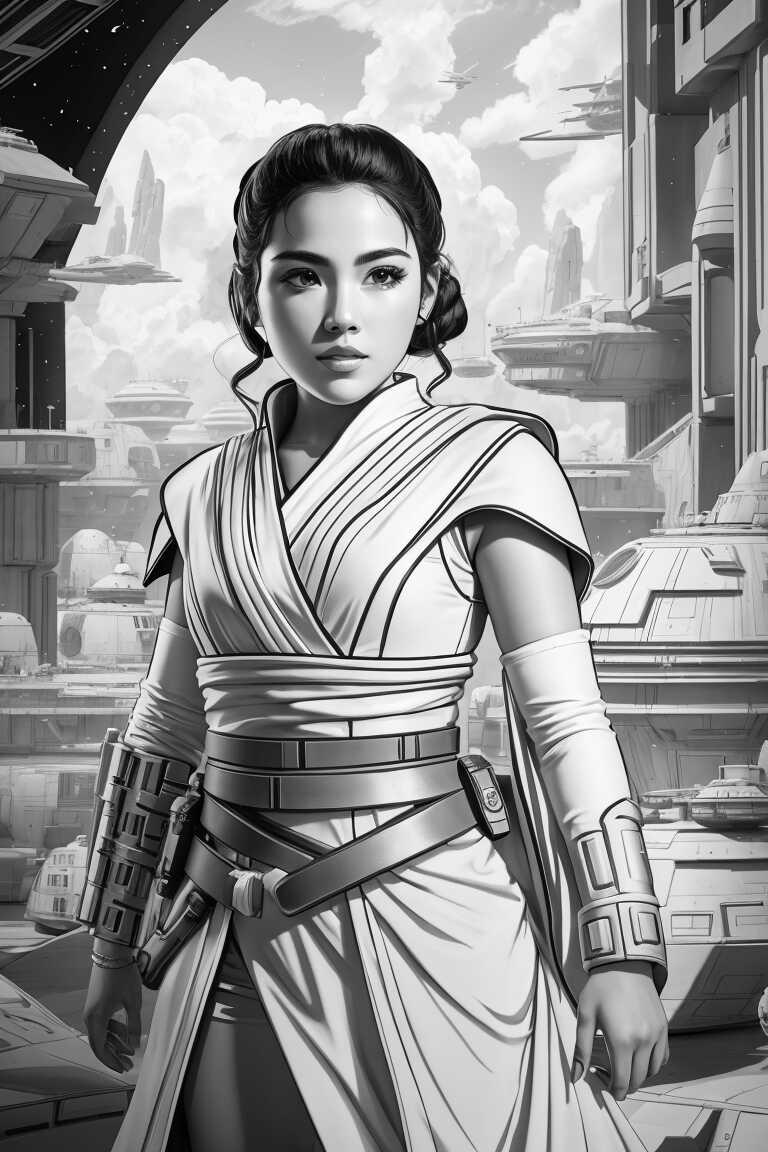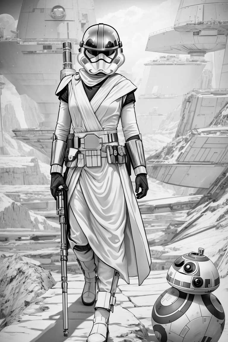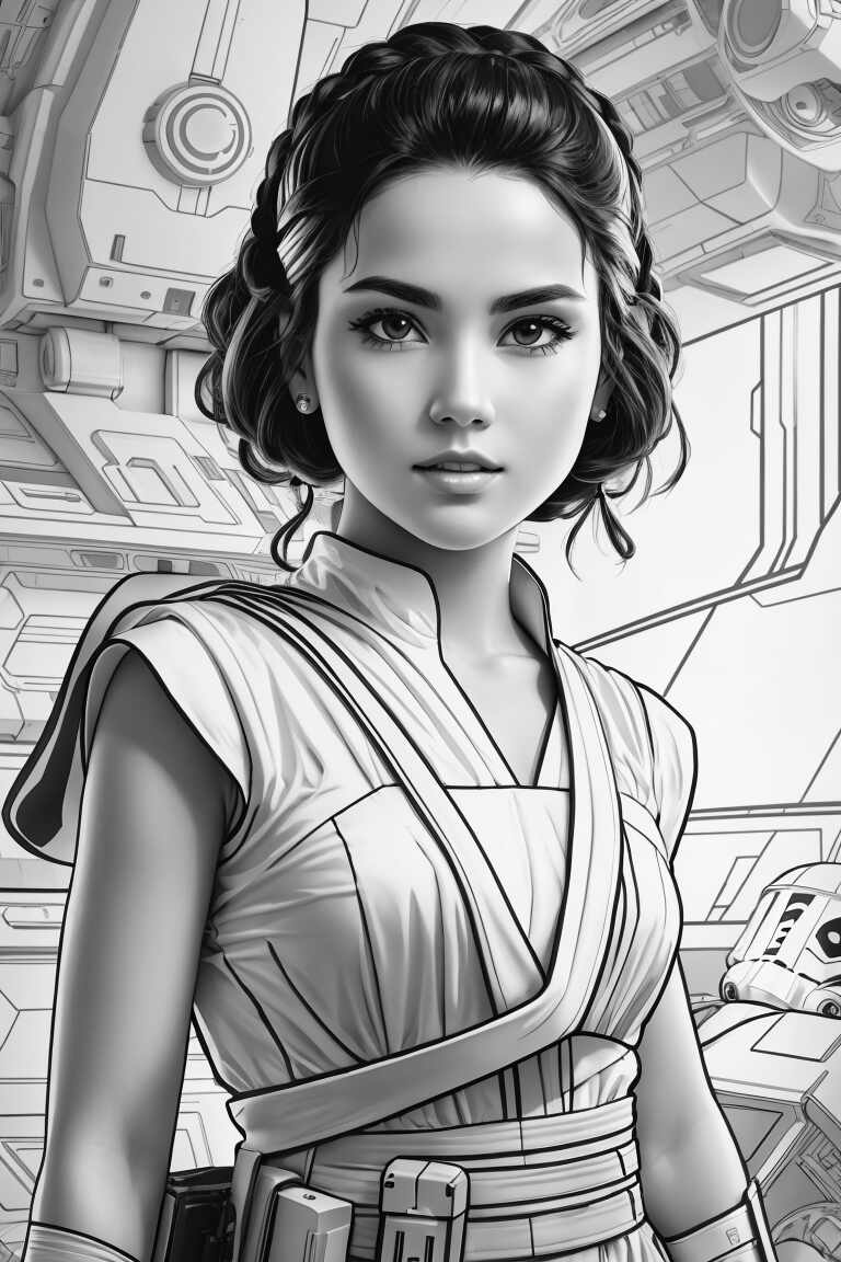 El primer dibujo que te presento es el valiente Rey, interpretada por la talentosa Daisy Ridley. Puedes colorear su cabello castaño con tonos dorados y su traje con colores terrosos. No olvides darle un toque especial a sus ojos, que brillan con el espíritu de una verdadera heroína. Rey es una inspiración para todos, ¡así que dale vida con tus colores más poderosos!