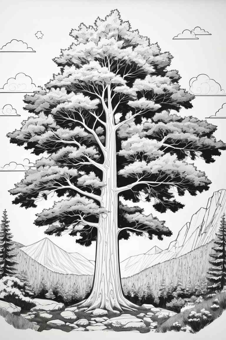 Este árbol de gran altura y tronco recto es común en las regiones montañosas de América del Norte. Puedes colorearlo con diferentes tonos de verde para representar las diferentes capas de agujas y añadir algunos detalles en marrón para simular la corteza rugosa.