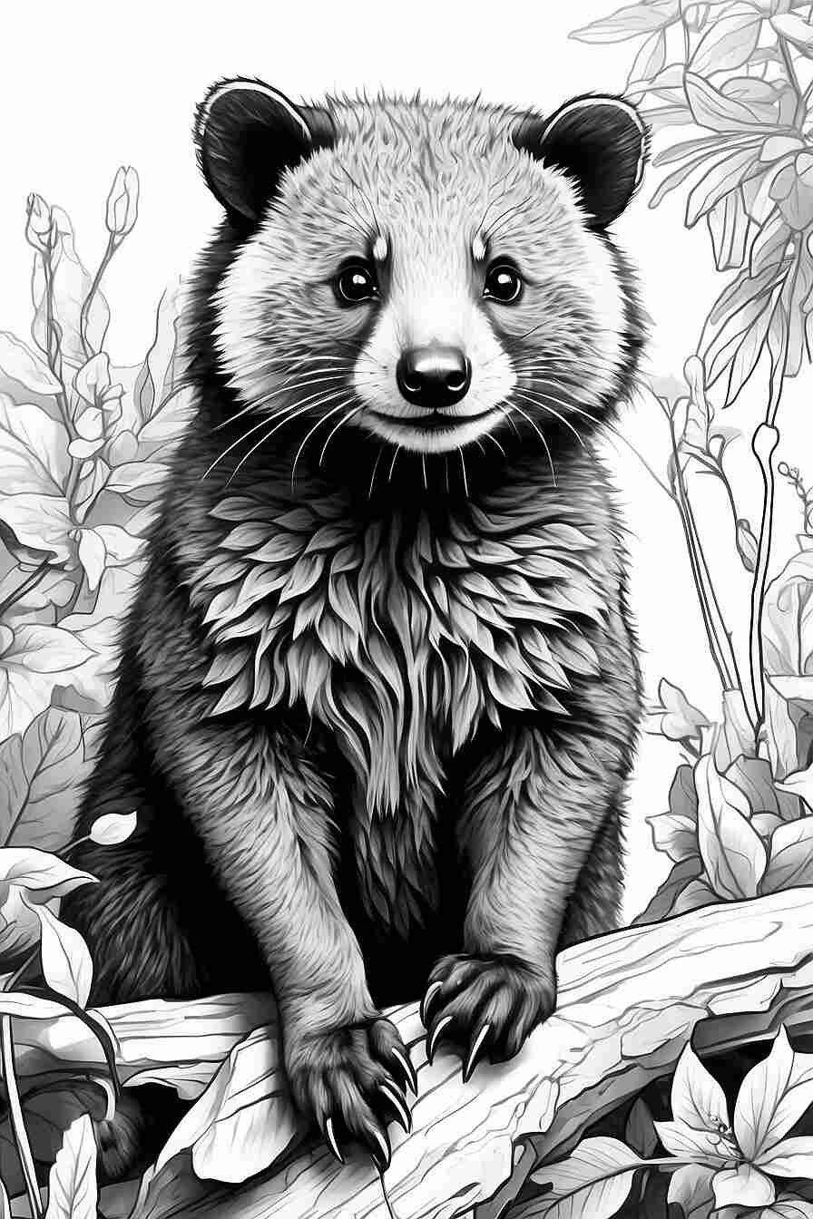 1. “Binturong en su hábitat natural”: En este dibujo, podrán colorear a nuestro amiguito Binturong disfrutando de un paseo por la frondosa jungla. Recuerden darle un toque especial a su característica cola prensil, perfecta para agarrarse a las ramas y trepar como verdaderos acróbatas.